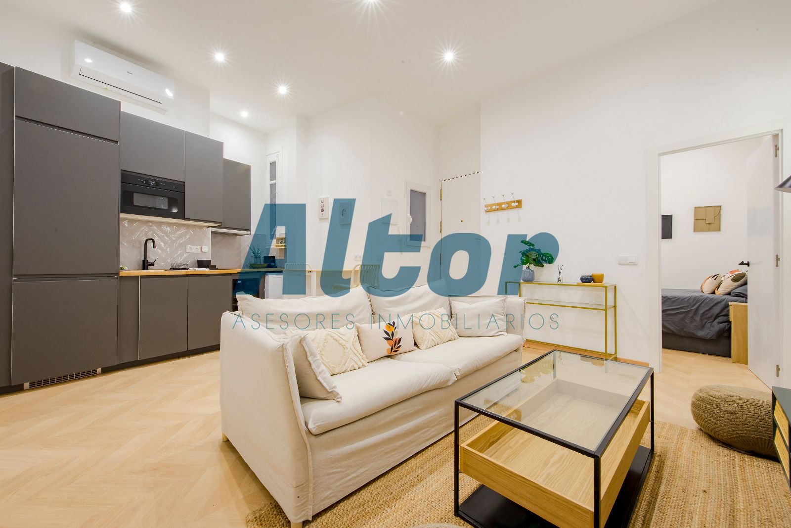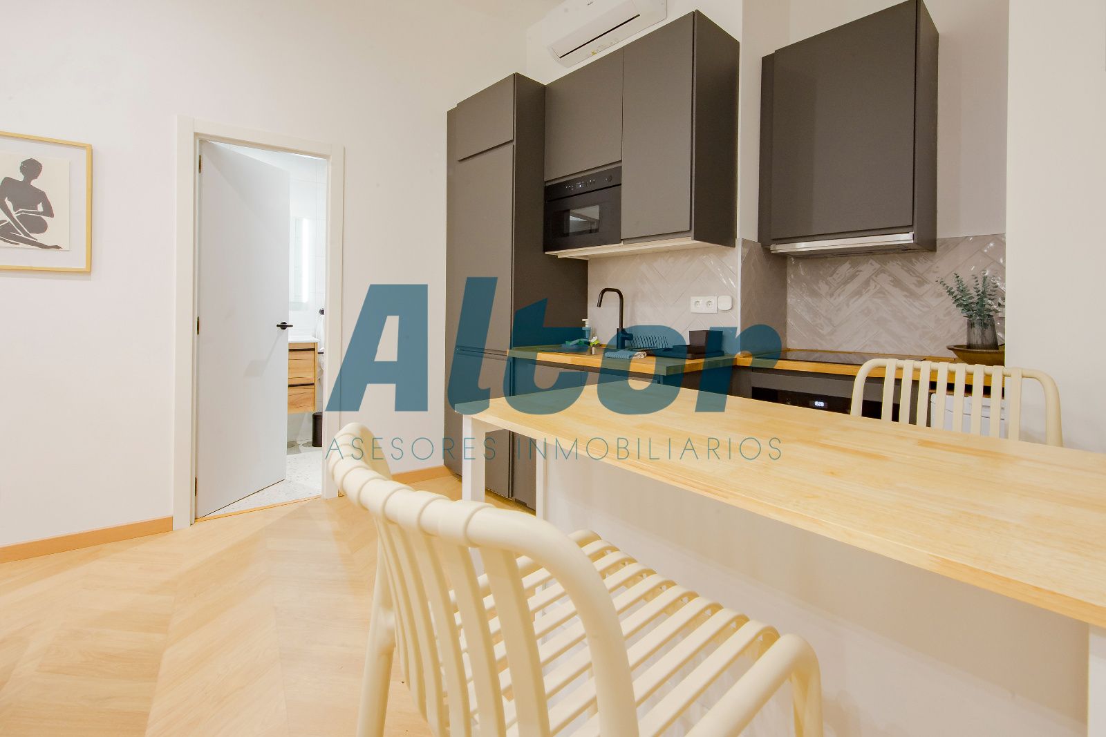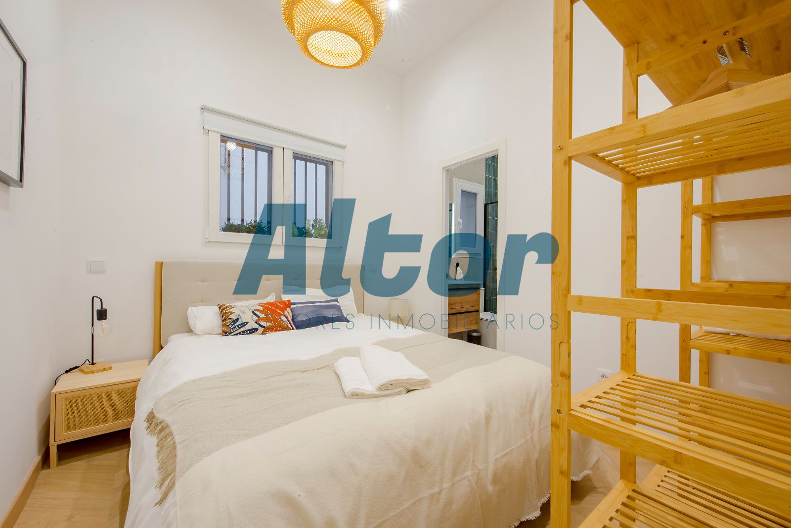 La propiedad cuenta con dos habitaciones, y dos baños completos, uno de ellos en suite, aportando mayor privacidad y confort. La zona de día se compone de un salón con cocina integrada, creando un espacio moderno y práctico, perfecto para el día a día.